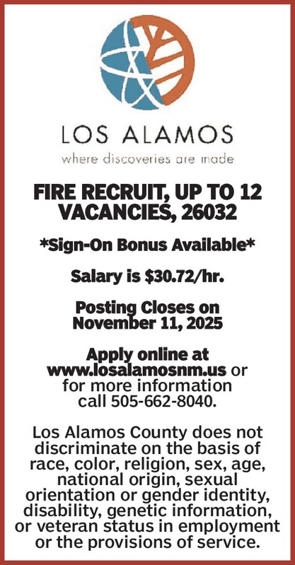FIRE RECRUIT, UP TO 12VACANCIES, 26032*Sign-On Bonus Available*Salary is $30.72/hr.Posting Closes onNovember 11, 2025Apply online atwww.losalamosnm.us orfor more informationcall 505-662-8040.Los Alamos County does not discriminate on the basis of race, color, religion, sex, age, national origin, sexual orientation or gender identity, disability, genetic information, or veteran status in employment or the provisions of service.
