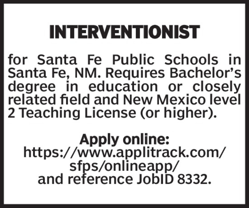 Interventionistfor Santa Fe Public Schools in Santa Fe, NM. Requires Bachelor’s degree in education or closely related field and New Mexico level 2 Teaching License (or higher).Apply online: https://www.applitrack.com/sfps/onlineapp/and reference JobID 8332.