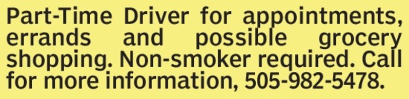 Part-Time Driver for appointments, errands and possible grocery shopping. Non-smoker required. Call for more information, 505-982-5478.