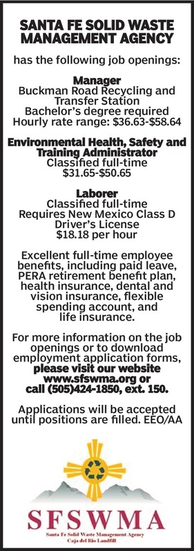 Santa Fe Solid WasteManagement Agencyhas the following job openings:ManagerBuckman Road Recycling and Transfer StationBachelor’s degree requiredHourly rate range: $36.63-$58.64Environmental Health, Safety and Training Administrator Classified full-time$31.65-$50.65LaborerClassified full-time Requires New Mexico Class D Driver’s License$18.18 per hourExcellent full-time employee benefits, including paid leave, PERA retirement benefit plan, health insurance, dental and vision insurance, flexible spending account, andlife insurance. For more information on the job openings or to download employment application forms, please visit our website www.sfswma.org orcall (505)424-1850, ext. 150.Applications will be accepted until positions are filled. EEO/AA