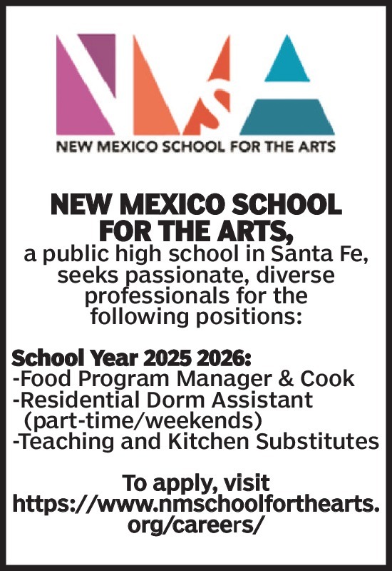 New Mexico Schoolfor the Arts,a public high school in Santa Fe,seeks passionate, diverse professionals for thefollowing positions:School Year 2025 2026:-Food Program Manager & Cook-Residential Dorm Assistant (part-time/weekends)-Teaching and Kitchen SubstitutesTo apply, visithttps://www.nmschoolforthearts.org/careers/
