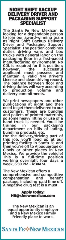 NIGHT SHIFT BACKUP DELIVERY DRIVER ANDPACKAGING SUPPORT SPECIALISTThe Santa Fe New Mexican is looking for a dependable person to join our award-winning team as Night Shift Backup Delivery Driver and Packaging Support Specialist. The position combines duties driving vans and box trucks with general labor on the packaging floor in a fast-paced manufacturing environment. No CDL is required for this position; however, the successful applicant must possess and maintain a valid NM Driver’s License and clean driving record. The balance between floor and driving duties will vary according to production volume and delivery commitments.We print newspapers and other publications at night and then need to get them delivered to our customers. These are bundles and pallets of printed materials, so some heavy lifting or use of a hand truck is needed. You’ll be trained in our packaging department on bills of lading, bundling products, etc.For the delivery/driving part of this job, you’ll load up at our printing facility in Santa Fe and then you’re off to Albuquerque or Clovis or other places in New Mexico. We provide the vehicle! This is a full-time position working overnight four days a week, 6:30 PM - 4:30AM.The New Mexican offers a comprehensive and competitive compensation and benefit package, including paid time off.A negative drug test is a must.Apply today: HR@sfnewmexican.comThe New Mexican is anequal opportunity employerand a New Mexico FamilyFriendly place to work.