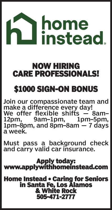 NOW HIRING CARE PROFESSIONALS!$1000 Sign-On BonusJoin our compassionate team and make a difference every day!We offer flexible shifts — 8am–12pm, 9am–1pm, 1pm–5pm, 1pm–8pm, and 8pm–8am — 7 days a week.Must pass a background check and carry valid car insurance.Apply today: www.applywithhomeinstead.comHome Instead • Caring for Seniors in Santa Fe, Los Alamos& White Rock505-471-2777