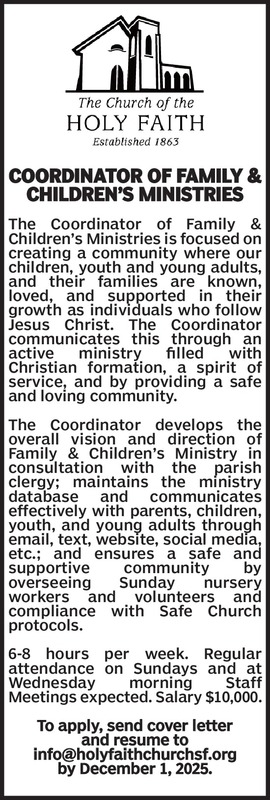 Coordinator of Family & Children’s MinistriesThe Coordinator of Family & Children’s Ministries is focused on creating a community where our children, youth and young adults, and their families are known, loved, and supported in their growth as individuals who follow Jesus Christ. The Coordinator communicates this through an active ministry filled with Christian formation, a spirit of service, and by providing a safe and loving community.The Coordinator develops the overall vision and direction of Family & Children’s Ministry in consultation with the parish clergy; maintains the ministry database and communicates effectively with parents, children, youth, and young adults through email, text, website, social media, etc.; and ensures a safe and supportive community by overseeing Sunday nursery workers and volunteers and compliance with Safe Church protocols.6-8 hours per week. Regular attendance on Sundays and at Wednesday morning Staff Meetings expected. Salary $10,000.To apply, send cover letterand resume to info@holyfaithchurchsf.orgby December 1, 2025.