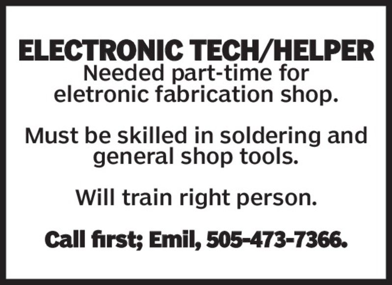 ELECTRONIC TECH/HELPERNeeded part-time foreletronic fabrication shop.Must be skilled in soldering and general shop tools. Will train right person.Call first; Emil, 505-473-7366.