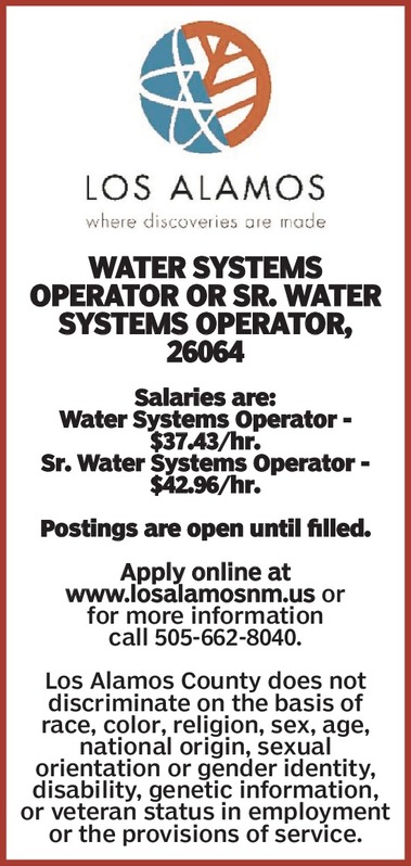 WATER SYSTEMS OPERATOR or SR. WATER SYSTEMS OPERATOR, 26064Salaries are:Water Systems Operator - $37.43/hr.Sr. Water Systems Operator - $42.96/hr.Postings are open until filled.Apply online atwww.losalamosnm.us orfor more informationcall 505-662-8040.Los Alamos County does not discriminate on the basis ofrace, color, religion, sex, age,national origin, sexualorientation or gender identity, disability, genetic information,or veteran status in employmentor the provisions of service.