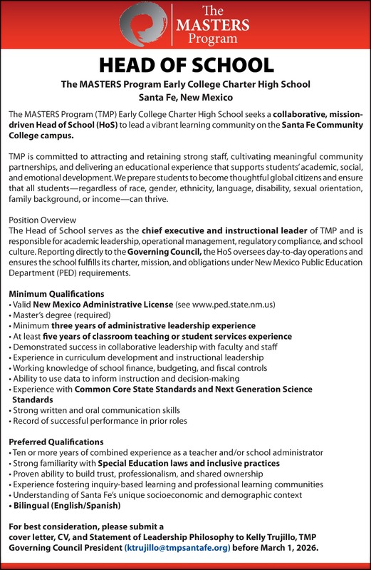 The MASTERS Program Early College Charter High SchoolSanta Fe, New MexicoThe MASTERS Program (TMP) Early College Charter High School seeks a collaborative, mission-driven Head of School (HoS) to lead a vibrant learning community on the Santa Fe Community College campus.TMP is committed to attracting and retaining strong staff, cultivating meaningful community partnerships, and delivering an educational experience that supports students’ academic, social, and emotional development. We prepare students to become thoughtful global citizens and ensure that all students—regardless of race, gender, ethnicity, language, disability, sexual orientation, family background, or income—can thrive.Position OverviewThe Head of School serves as the chief executive and instructional leader of TMP and is responsible for academic leadership, operational management, regulatory compliance, and school culture. Reporting directly to the Governing Council, the HoS oversees day-to-day operations and ensures the school fulfills its charter, mission, and obligations under New Mexico Public Education Department (PED) requirements. Minimum Qualifications• Valid New Mexico Administrative License (see www.ped.state.nm.us)• Master’s degree (required)• Minimum three years of administrative leadership experience• At least five years of classroom teaching or student services experience• Demonstrated success in collaborative leadership with faculty and staff• Experience in curriculum development and instructional leadership• Working knowledge of school finance, budgeting, and fiscal controls• Ability to use data to inform instruction and decision-making• Experience with Common Core State Standards and Next Generation Science Standards• Strong written and oral communication skills• Record of successful performance in prior rolesPreferred Qualifications• Ten or more years of combined experience as a teacher and/or school administrator• Strong familiarity with Special Education laws and inclusive practices• Proven ability to build trust, professionalism, and shared ownership• Experience fostering inquiry-based learning and professional learning communities• Understanding of Santa Fe’s unique socioeconomic and demographic context• Bilingual (English/Spanish)Essential Job FunctionsThe Head of School will:• Provide visionary and collaborative leadership that advances TMP’s mission and culture• Partner with staff to make sound instructional and operational decisions• Model professional conduct that reflects positively on the school and profession• Foster an inclusive, culturally responsive, and respectful school climate• Lead instructional excellence, including:• Hiring and supervising faculty• Teacher evaluation and NMTEACH compliance• Data-informed instructional improvement• Oversight of professional learning communities, tutoring, and Friday Projects• Collaborate in the development and stewardship of the school budget• Ensure compliance with internal controls, procurement rules, and fiscal policies• Maintain strong working relationships with Santa Fe Community College partners• Establish effective communication systems with staff, students, families, and community stakeholders• Oversee accurate student records, attendance reporting, and compliance documentation• Work closely with the Director of Guidance on enrollment, scheduling, advising, and student support• Ensure staff participation in IEP and 504 processes• Support Advisory School Councils and ensure statutory compliance• Submit timely and accurate state and federal reports• Maintain a safe, orderly, and supportive learning environment• Oversee audits, financial reporting, grants, and operational projects• Serve as TMP’s representative with families, partners, and the broader community• Communicate regularly with the Governing Council, providing clear data and insights to support governance and oversight• Perform other related duties as assigned to meet the needs of the schoolFor best consideration, please submit a cover letter, CV, and Statement of Leadership Philosophy to Governing Council President before March 1, 2026.