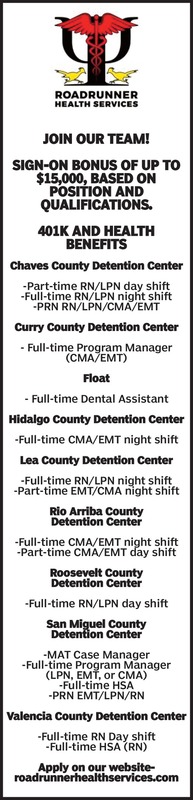 Join Our Team!Sign-on bonus of up to $15,000, based on position and qualifications.401k and Health BenefitsChaves County Detention Center-Part-time RN/LPN day shift-Full-time RN/LPN night shift-PRN RN/LPN/CMA/EMTCurry County Detention Center- Full-time Program Manager (CMA/EMT)Float- Full-time Dental Assistant Hidalgo County Detention Center-Full-time CMA/EMT night shift Lea County Detention Center -Full-time RN/LPN night shift-Part-time EMT/CMA night shiftRio Arriba CountyDetention Center -Full-time CMA/EMT night shift-Part-time CMA/EMT day shift Roosevelt CountyDetention Center -Full-time RN/LPN day shiftSan Miguel CountyDetention Center-MAT Case Manager-Full-time Program Manager(LPN, EMT, or CMA)-Full-time HSA -PRN EMT/LPN/RN Valencia County Detention Center -Full-time RN Day shift-Full-time HSA (RN)Apply on our website-roadrunnerhealthservices.com