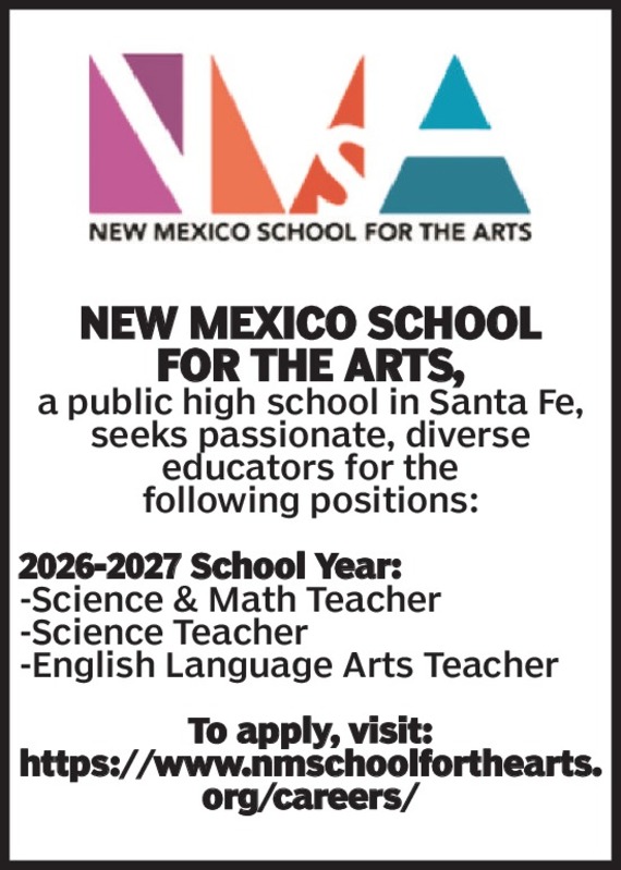 New Mexico Schoolfor the Arts,a public high school in Santa Fe,seeks passionate, diverse educators for thefollowing positions:2026-2027 School Year:-Science & Math Teacher-Science Teacher-English Language Arts TeacherTo apply, visit:https://www.nmschoolforthearts.org/careers/