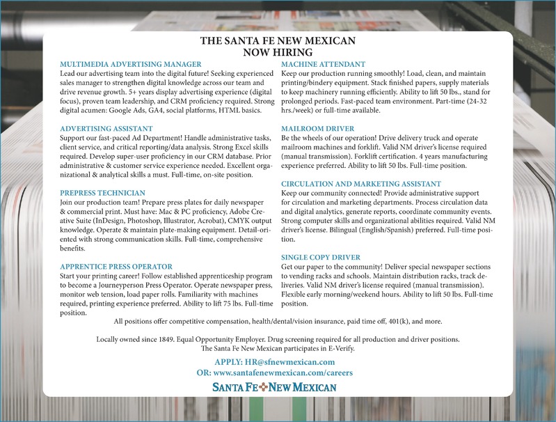THE SANTA FE NEW MEXICANNOW HIRINGMULTIMEDIA ADVERTISING MANAGERLead our advertising team into the digital future! Seeking experienced sales manager to strengthen digital knowledge across our team and drive revenue growth. 5+ years display advertising experience (digital focus), proven team leadership, and CRM proficiency required. Strong digital acumen: Google Ads, GA4, social platforms, HTML basics. ADVERTISING ASSISTANTSupport our fast-paced Ad Department! Handle administrative tasks, client service, and critical reporting/data analysis. Strong Excel skills required. Develop super-user proficiency in our CRM database. Prior admin & customer service experience needed. Excellent organizational & analytical skills a must. Full-time, on-site position.PREPRESS TECHNICIANJoin our production team! Prepare press plates for daily newspaper & commercial print. Must have: Mac & PC proficiency, Adobe Creative Suite (InDesign, Photoshop, Illustrator, Acrobat), CMYK output knowledge. Operate & maintain plate-making equipment. Detail-oriented with strong communication skills. Full-time, comprehensive benefits.APPRENTICE PRESS OPERATORStart your printing career! Follow established apprenticeship program to become a Journeyperson Press Operator. Operate newspaper press, monitor web tension, load paper rolls. Familiarity with machines required; printing experience preferred. Ability to lift 75 lbs. Full-time position.MACHINE ATTENDANTKeep our production running smoothly! Load, clean, and maintain printing/bindery equipment. Stack finished papers, supply materials to keep machinery running efficiently. Ability to lift 50 lbs, stand for prolonged periods. Fast-paced team environment. Part-time (24-32 hrs/week) or full-time available.MAILROOM DRIVERBe the wheels of our operation! Drive delivery truck and operate mailroom machines and forklift. Valid NM driver's license required (manual transmission). Forklift certification. 4 years manufacturing experience preferred. Ability to lift 50 lbs. Full-time position.CIRCULATION AND MARKETING ASSISTANTKeep our community connected! Provide administrative support for circulation and marketing departments. Process circulation data and digital analytics, generate reports, coordinate community events. Strong computer skills and organizational abilities required. Valid NM driver's license. Bilingual (English/Spanish) preferred. Full-time position.SINGLE COPY DRIVERGet our paper to the community! Deliver special newspaper sections to vending racks and schools. Maintain distribution racks, track deliveries. Valid NM driver's license required (manual transmission). Flexible early morning/weekend hours. Ability to lift 50 lbs. Full-time position.All positions offer competitive compensation, health/dental/vision insurance, paid time off, 401(k), and more. Locally owned since 1849. Equal Opportunity Employer. Drug screening required for all production and driver positions. The Santa Fe New Mexican participates in E-Verify.