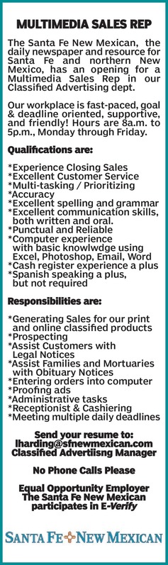 MULTIMEDIA SALES REPThe Santa Fe New Mexican, the daily newspaper and resource for Santa Fe and northern New Mexico, has an opening for a Multimedia Sales Rep in our Classified Advertising dept.Our workplace is fast-paced, goal & deadline oriented, supportive, and friendly! Hours are 8a.m. to 5p.m., Monday through Friday. Qualifications are:*Experience Closing Sales*Excellent Customer Service *Multi-tasking / Prioritizing*Accuracy*Excellent spelling and grammar*Excellent communication skills, both written and oral.*Punctual and Reliable*Computer experience with basic knowlwdge using Excel, Photoshop, Email, Word *Cash register experience a plus*Spanish speaking a plus, but not requiredResponsibilities are: *Generating Sales for our print and online classified products*Prospecting*Assist Customers with Legal Notices*Assist Families and Mortuaries with Obituary Notices*Entering orders into computer*Proofing ads*Administrative tasks*Receptionist & Cashiering*Meeting multiple daily deadlinesSend your resume to: lharding@sfnewmexican.com Classified Advertiisng ManagerNo Phone Calls PleaseEqual Opportunity EmployerThe Santa Fe New Mexican participates in E-Verify
