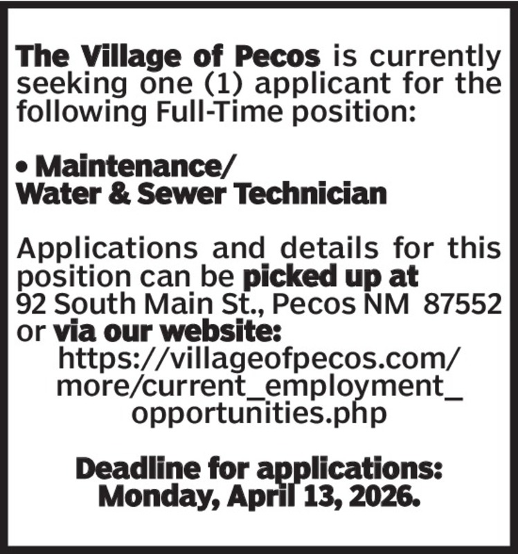 The Village of Pecos is currently seeking one (1) applicant for the following Full-Time position:• Maintenance/Water & Sewer TechnicianApplications and details for this position can be picked up at92 South Main St., Pecos NM 87552 or via our website:https://villageofpecos.com/more/current_employment_opportunities.phpDeadline for applications:Monday, April 13, 2026.