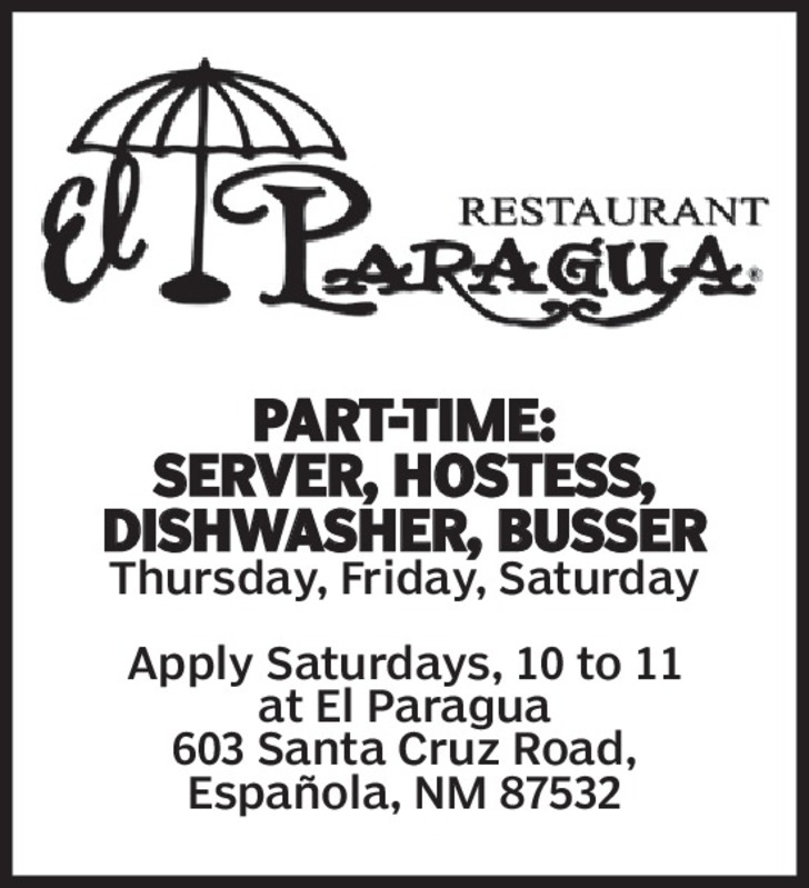 Part-Time:Server, Hostess, Dishwasher, BusserThursday, Friday, SaturdayApply Saturdays, 10 to 11at El Paragua603 Santa Cruz Road, Española, NM 87532