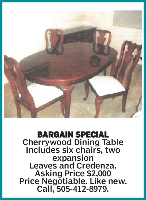 BARGAIN SPECIALCherrywood Dining TableIncludes six chairs, two expansionLeaves and Credenza. Asking Price $2,000Price Negotiable. Like new. Call, 505-412-8979.