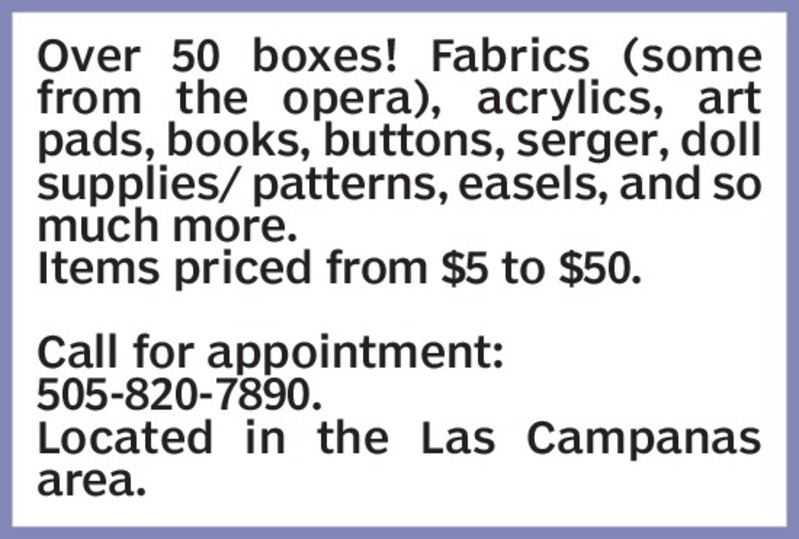 Over 50 boxes! Fabrics (some from the opera), acrylics, art pads, books, buttons, serger, doll supplies/ patterns, easels, and so much more.Items priced from $5 to $50.Call for appointment: 505-820-7890.Located in the Las Campanas area.