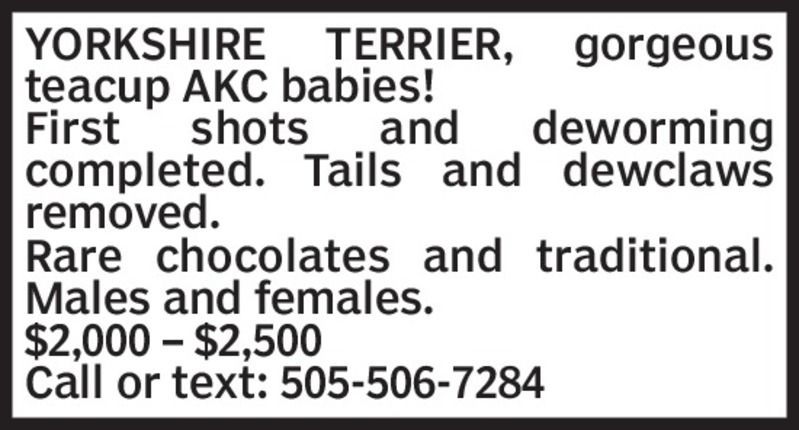 YORKSHIRE TERRIER, gorgeous teacup AKC babies!First shots and deworming completed. Tails and dewclaws removed.Rare chocolates and traditional. Males and females.$2,000 – $2,500Call or text: 505-506-7284