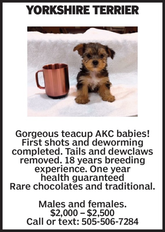 YORKSHIRE TERRIERGorgeous teacup AKC babies!First shots and deworming completed. Tails and dewclaws removed. 18 years breeding experience. One yearhealth guaranteedRare chocolates and traditional. Males and females.$2,000 – $2,500Call or text: 505-506-7284