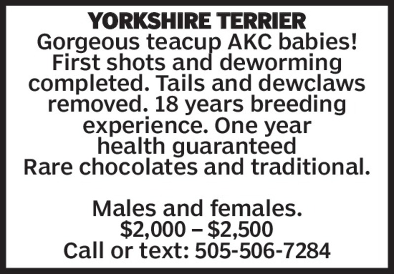 YORKSHIRE TERRIERGorgeous teacup AKC babies!First shots and deworming completed. Tails and dewclaws removed. 18 years breeding experience. One yearhealth guaranteedRare chocolates and traditional. Males and females.$2,000 – $2,500Call or text: 505-506-7284