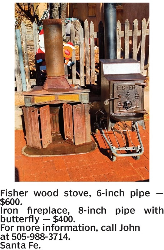 Fisher wood stove, 6-inch pipe — $600.Iron fireplace, 8-inch pipe with butterfly — $400.For more information, call John at 505-988-3714.Santa Fe.