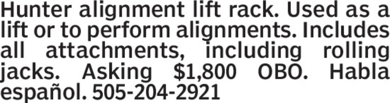 Hunter alignment lift rack. Used as a lift or to perform alignments. Includes all attachments, including rolling jacks. Asking $1,800 OBO. Habla español. 505-204-2921