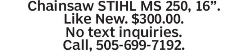 Chainsaw STIHL MS 250, 16”. Like New. $300.00. No text inquiries. Call, 505-699-7192.