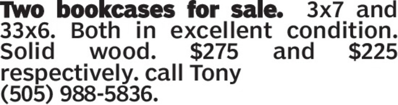 Two bookcases for sale. 3x7 and 33x6. Both in excellent condition. Solid wood. $275 and $225 respectively. call Tony(505) 988-5836.