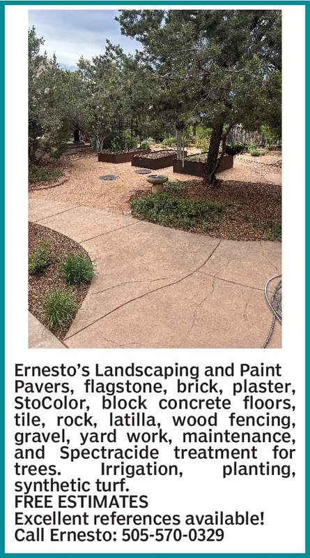 Ernesto’s Landscaping and PaintPavers, flagstone, brick, plaster, StoColor, block concrete floors, tile, rock, latilla, wood fencing, gravel, yard work, maintenance, and Spectracide treatment for trees. Irrigation, planting, synthetic turf.FREE ESTIMATESExcellent references available!Call Ernesto: 505-570-0329