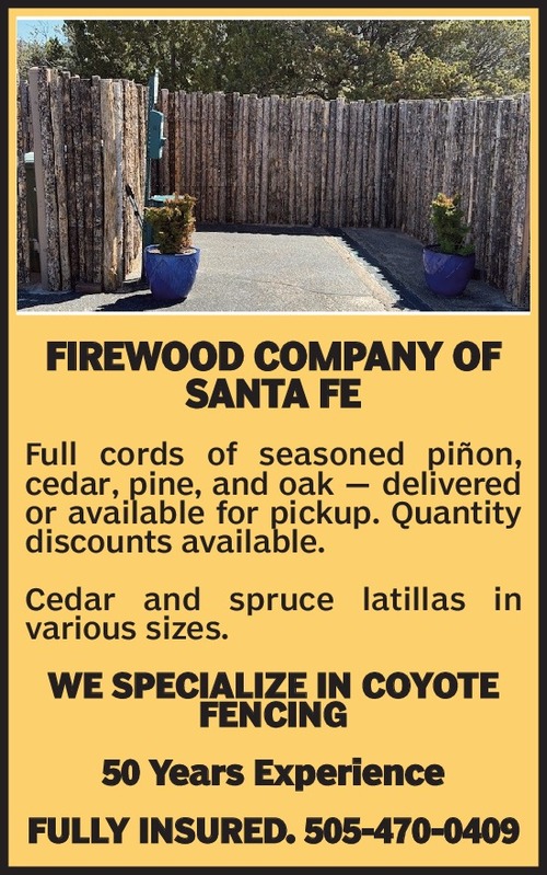 FIREWOOD COMPANY OF SANTA FEFull cords of seasoned piñon, cedar, pine, and oak — delivered or available for pickup. Quantity discounts available.Cedar and spruce latillas in various sizes.WE SPECIALIZE IN COYOTE FENCING50 Years Experience FULLY INSURED. 505-470-0409
