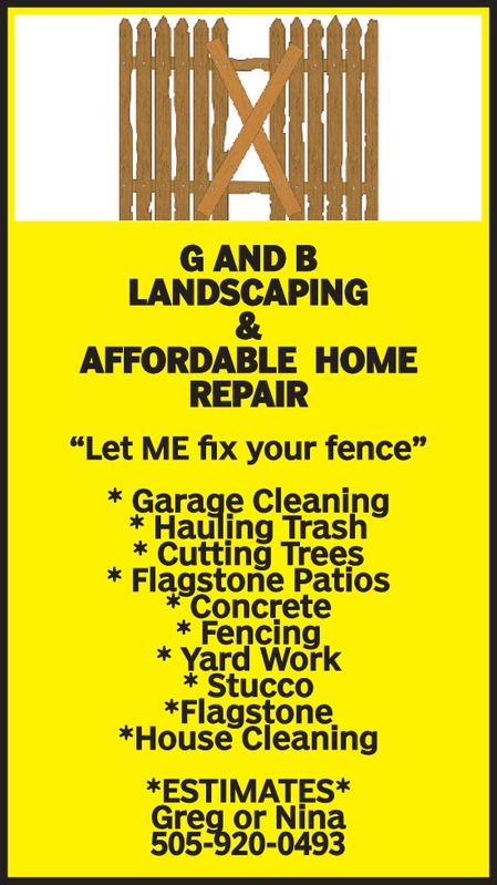 G and B Landscaping & Affordable Home Repair “Let ME fix your fence” * Garage Cleaning * Hauling Trash * Cutting Trees * Flagstone Patios * Concrete * Fencing * Yard Work * Stucco *Flagstone *House Cleaning*ESTIMATES* Greg or Nina 505-920-0493