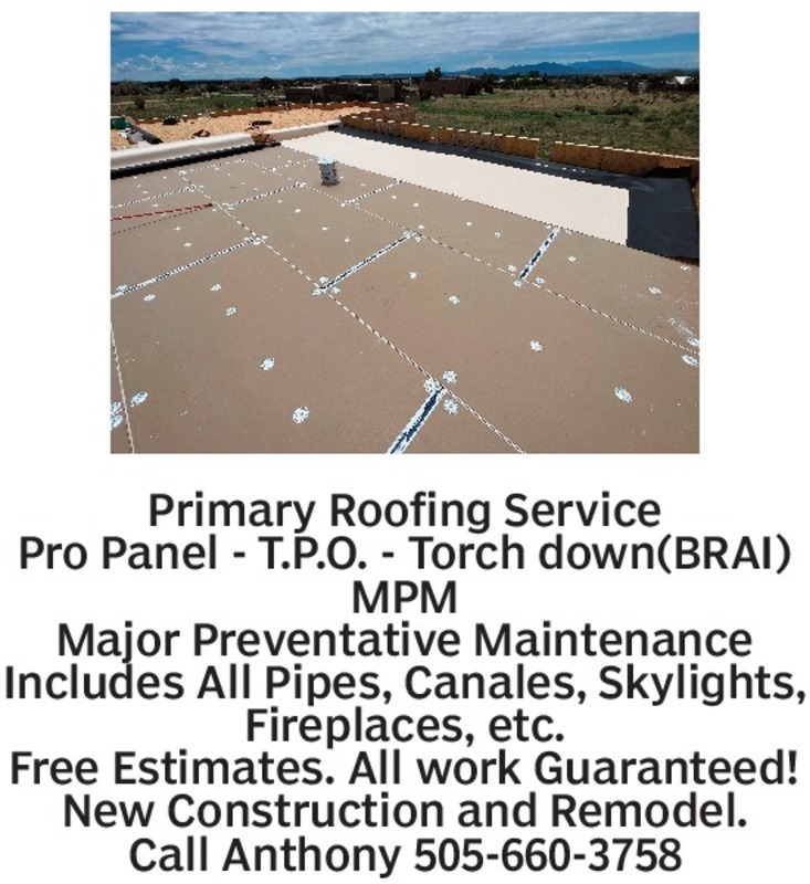 Primary Roofing ServicePro Panel - T.P.O. - Torch down(BRAI)MPMMajor Preventative MaintenanceIncludes All Pipes, Canales, Skylights, Fireplaces, etc.Free Estimates. All work Guaranteed! New Construction and Remodel.Call Anthony 505-660-3758