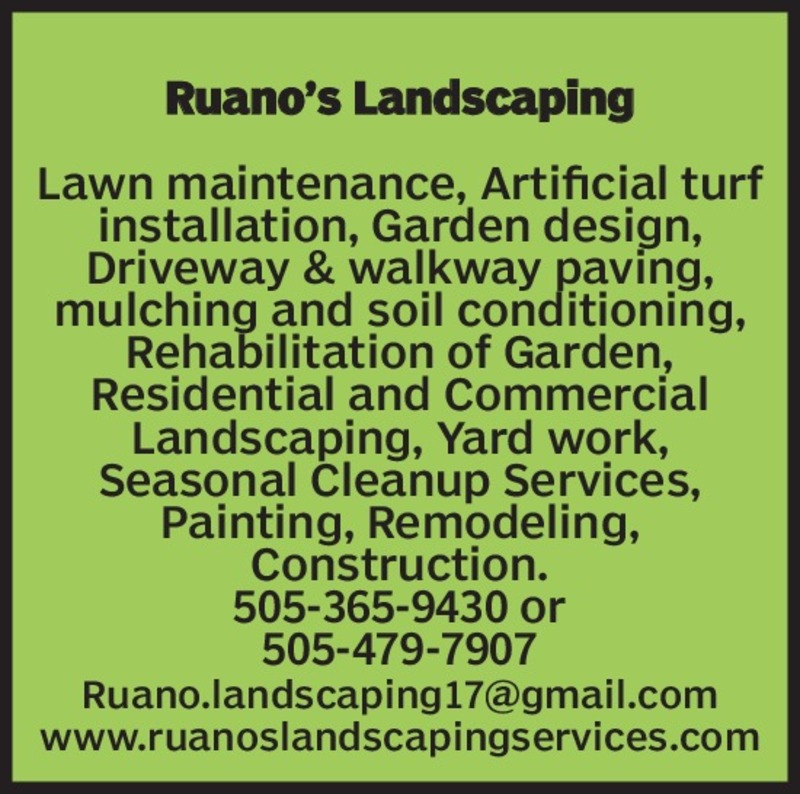 Ruano’s Landscaping Lawn maintenance, Artificial turf installation, Garden design, Driveway & walkway paving, mulching and soil conditioning, Rehabilitation of Garden, Residential and Commercial Landscaping, Yard work, Seasonal Cleanup Services, Painting, Remodeling, Construction. 505-365-9430 or 505-479-7907Ruano.landscaping17@gmail.com www.ruanoslandscapingservices.com