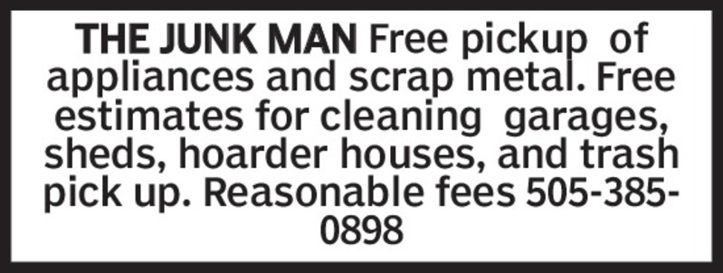 The junk man Free pickup of appliances and scrap metal. Free estimates for cleaning garages, sheds, hoarder houses, and trash pick up. Reasonable fees 505-385-0898
