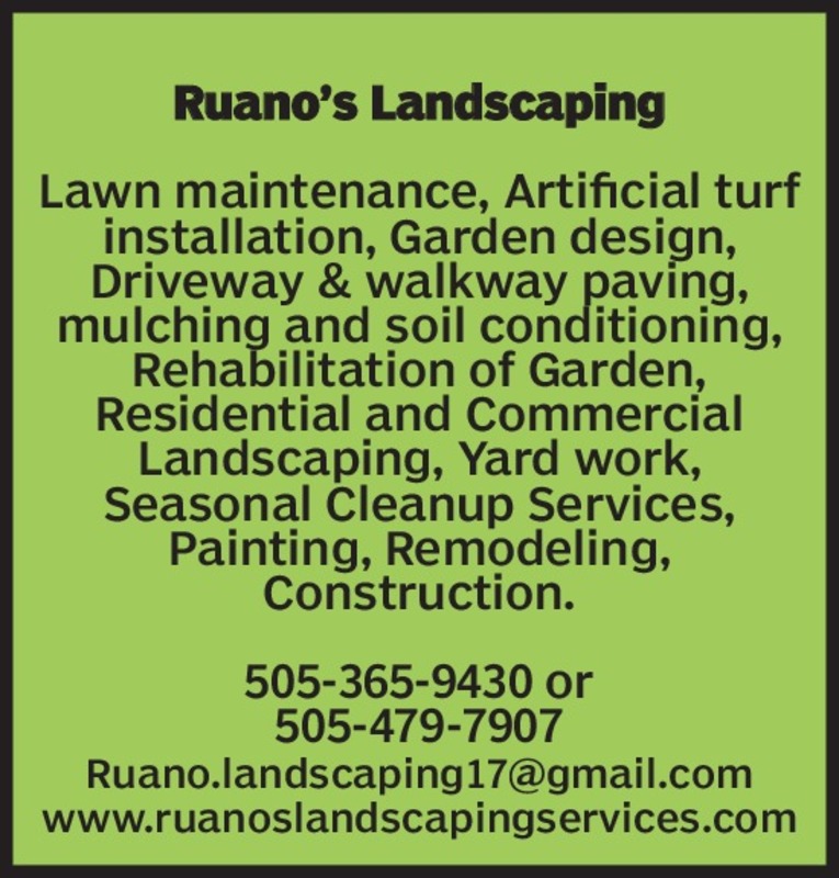 Ruano’s Landscaping Lawn maintenance, Artificial turf installation, Garden design, Driveway & walkway paving, mulching and soil conditioning, Rehabilitation of Garden, Residential and Commercial Landscaping, Yard work, Seasonal Cleanup Services, Painting, Remodeling, Construction. 505-365-9430 or 505-479-7907Ruano.landscaping17@gmail.com www.ruanoslandscapingservices.com