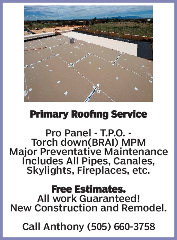 Primary Roofing ServicePro Panel - T.P.O. - Torch down(BRAI) MPMMajor Preventative MaintenanceIncludes All Pipes, Canales, Skylights, Fireplaces, etc.Free Estimates. All work Guaranteed! New Construction and Remodel.Call Anthony (505) 660-3758