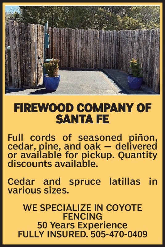 FIREWOOD COMPANY OF SANTA FEFull cords of seasoned piñon, cedar, pine, and oak — delivered or available for pickup. Quantity discounts available.Cedar and spruce latillas in various sizes.WE SPECIALIZE IN COYOTE FENCING50 Years Experience FULLY INSURED. 505-470-0409