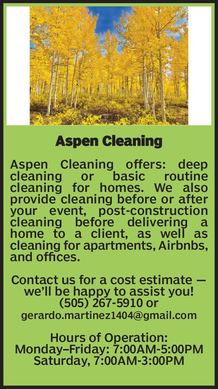 Aspen CleaningAspen Cleaning offers: deep cleaning or basic routine cleaning for homes. We also provide cleaning before or after your event, post-construction cleaning before delivering a home to a client, as well as cleaning for apartments, Airbnbs, and offices.Contact us for a cost estimate — we’ll be happy to assist you!(505) 267-5910 or gerardo.martinez1404@gmail.comHours of Operation: Monday–Friday: 7:00AM-5:00PM Saturday, 7:00AM-3:00PM