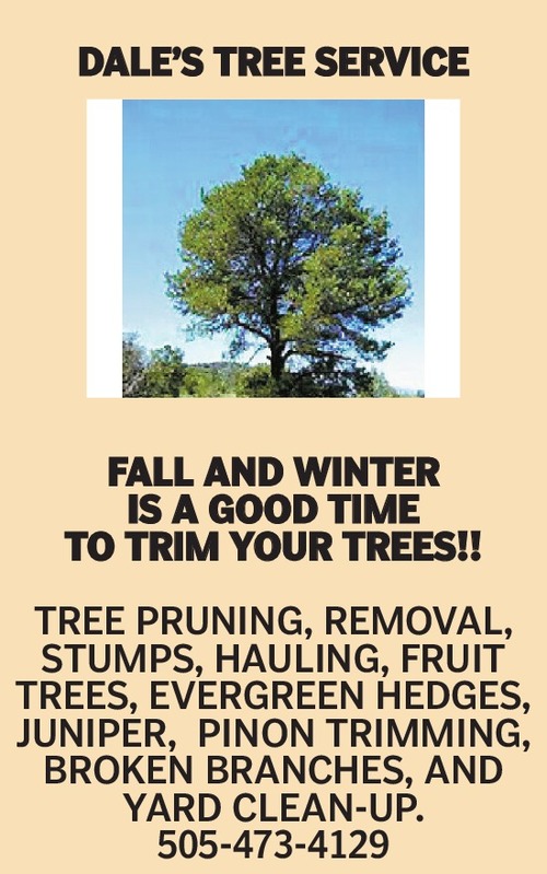 DALE’S TREE SERVICE Fall and winter is a good time to trim your trees!! Tree Pruning, Removal, Stumps, Hauling, Fruit Trees, Evergreen Hedges, Juniper, Pinon Trimming, Broken Branches, and Yard Clean-up. 505-473-4129