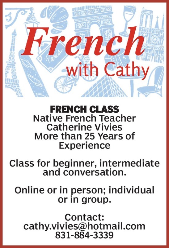 FRENCH CLASSNative French Teacher Catherine Vivies More than 25 Years of Experience Class for beginner, intermediate and conversation. Online or in person; individual or in group. Contact: cathy.vivies@hotmail.com831-884-3339