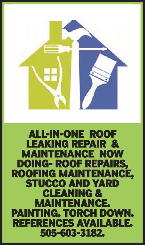 ALL-IN-ONE Roof Leaking Repair & Maintenance NOW DOING- Roof Repairs, Roofing Maintenance, Stucco and Yard Cleaning & Maintenance. Painting. Torch Down. References Available. 505-603-3182.