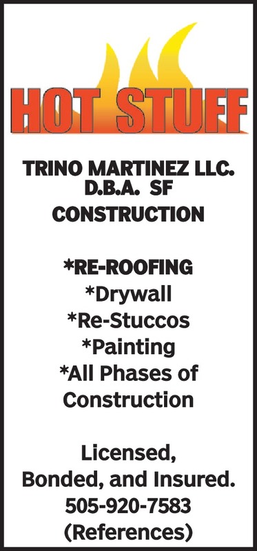 Trino Martinez LLC.D.B.A. SF Construction *Re-Roofing *Drywall *Re-Stuccos *Painting *All Phases of Construction Licensed, Bonded, and Insured.505-920-7583(References)