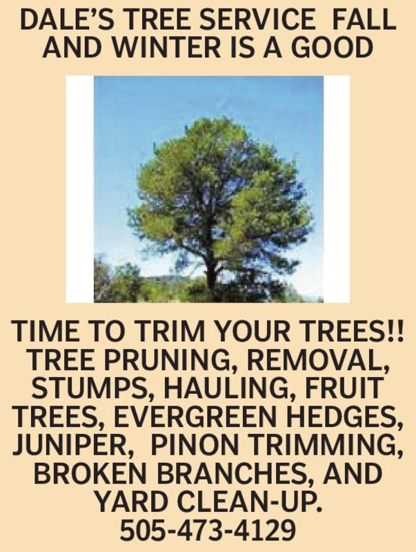DALE’S TREE SERVICE Fall and winter is a good time to trim your trees!! Tree Pruning, Removal, Stumps, Hauling, Fruit Trees, Evergreen Hedges, Juniper, Pinon Trimming, Broken Branches, and Yard Clean-up. 505-473-4129