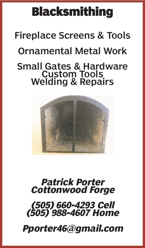 BlacksmithingFireplace Screens & ToolsOrnamental Metal WorkSmall Gates & HardwareCustom ToolsWelding & RepairsPatrick PorterCottonwood Forge(505) 660-4293 Cell(505) 988-4607 HomePporter46@gmail.com