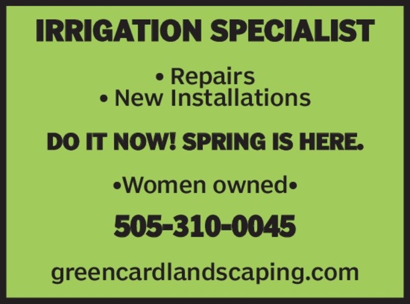 IRRIGATION SPECIALIST • Repairs • New InstallationsDO IT NOW! SPRING IS HERE.•Women owned• 505-310-0045greencardlandscaping.com