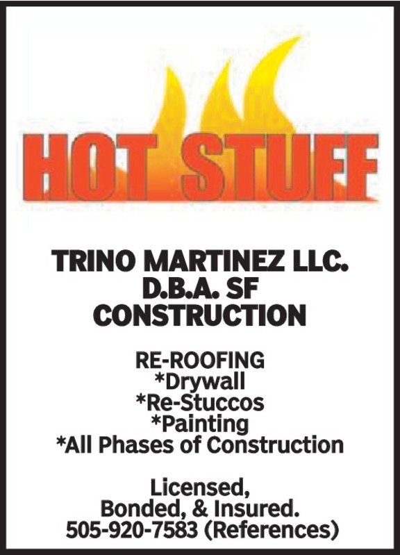 TRINO MARTINEZ LLC.D.B.A. SFCONSTRUCTIONRE-ROOFING*Drywall*Re-Stuccos*Painting*All Phases of ConstructionLicensed, Bonded, & Insured. 505-920-7583 (References)