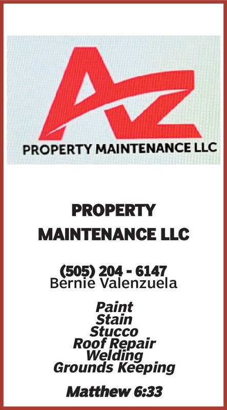 PROPERTY MAINTENANCE LLC(505) 204 - 6147Bernie Valenzuela PaintStain Stucco Roof Repair WeldingGrounds Keeping Matthew 6:33
