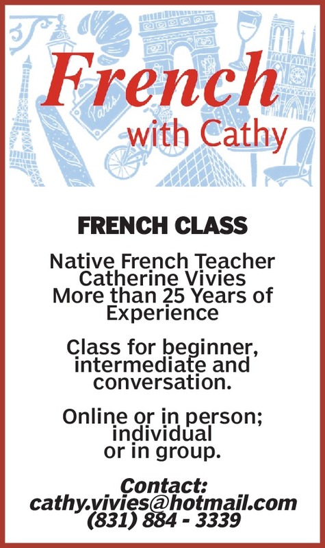 FRENCH CLASSNative French Teacher Catherine Vivies More than 25 Years of Experience Class for beginner, intermediate and conversation. Online or in person; individual or in group. Contact: cathy.vivies@hotmail.com(831) 884 - 3339