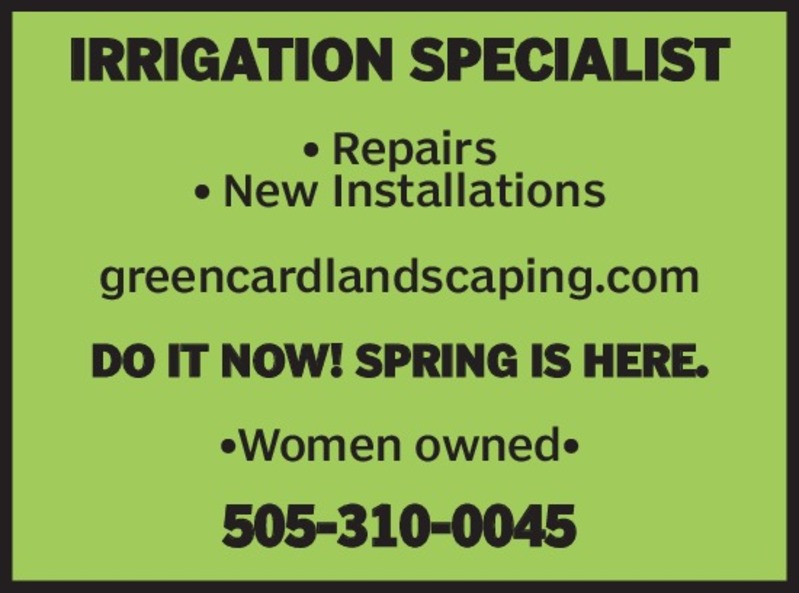 IRRIGATION SPECIALIST • Repairs • New Installationsgreencardlandscaping.comDO IT NOW! SPRING IS HERE.•Women owned• 505-310-0045